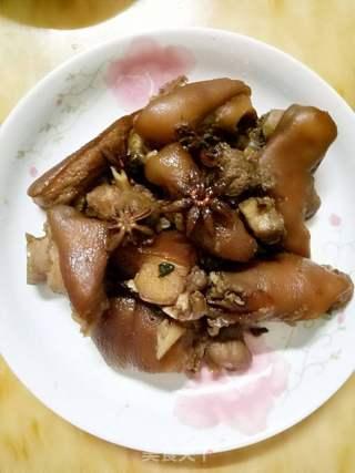 2. 炖煮:将煎好的猪蹄放入砂锅中,加入足够的水,放入姜片、葱段、八角、桂皮等香料,大火烧开后转小火炖煮约1小时,直到猪蹄炖至软烂。